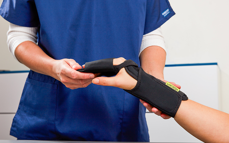 En komfortabel tekstil håndledsortose med to dorsale plastskinner, udviklet til når en volar skinne ikke tolereres eller giver ubehag.