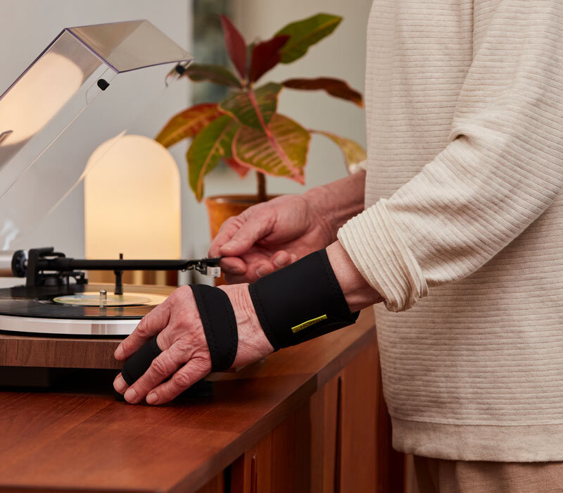 En tommelortose med plastskinne som giver støtte til tommelen og omkringliggende strukturer. Opbygningen af det underliggende materiale gør, at skinnen ikke trykker mod led eller muskulatur.